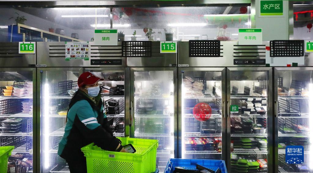 3月15日深夜,在位于上海閔行區(qū)老滬閔路的一家網絡購物平臺倉配站點,工作人員將一批生鮮肉制品放入冷藏柜。