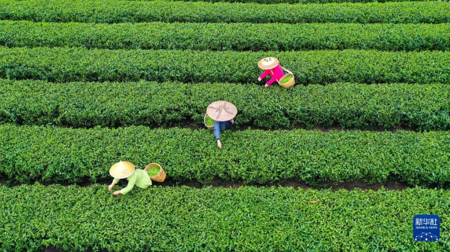 3月27日,茶農(nóng)在浙江省湖州市長興縣和平鎮(zhèn)灘龍橋村的高山茶園采摘茶鮮葉(無人機(jī)照片)。