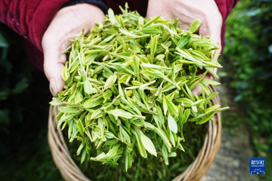 3月27日,在杭州西湖區(qū)的西湖龍井一級(jí)保護(hù)區(qū)的茶園里拍攝到的剛采摘的西湖龍井明前茶嫩芽。