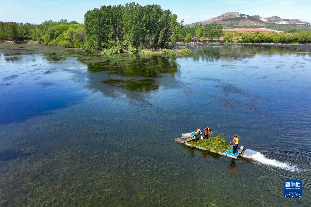4月21日,在山東省青州市堯王湖,工作人員清理水草和垃圾(無(wú)人機(jī)照片)。