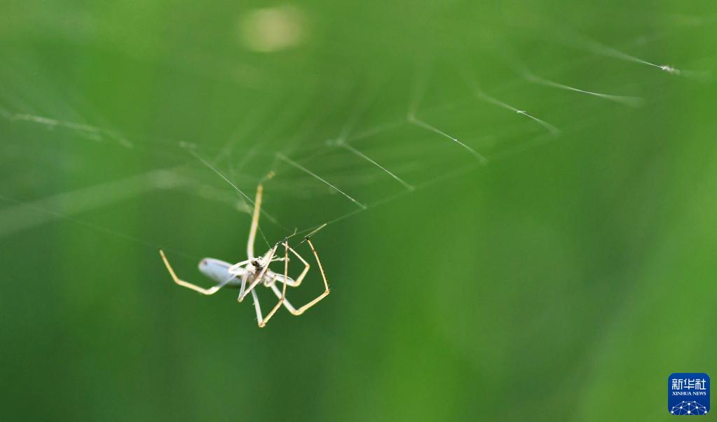 4月22日,在山東省滕州市西崗鎮(zhèn)馬廟村,蜘蛛在草叢里織網(wǎng)。