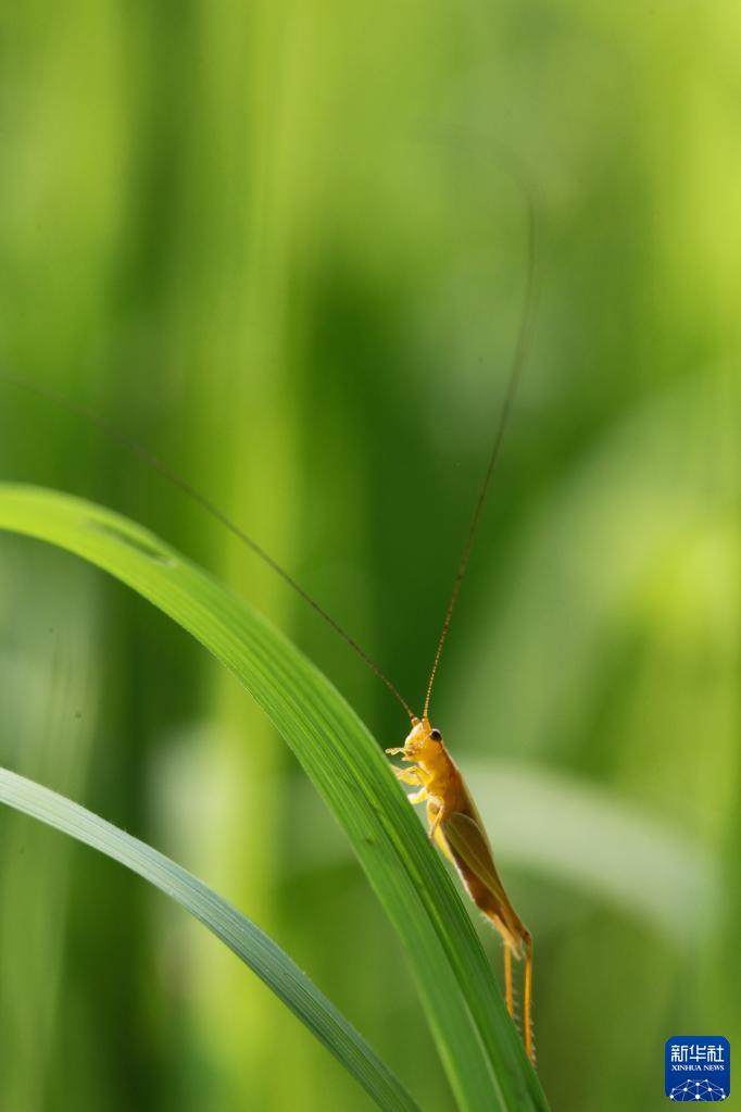 4月30日,昆蟲(chóng)在云南省西雙版納傣族自治州景洪市瀾滄江濕地的草叢中舞動(dòng)觸須。