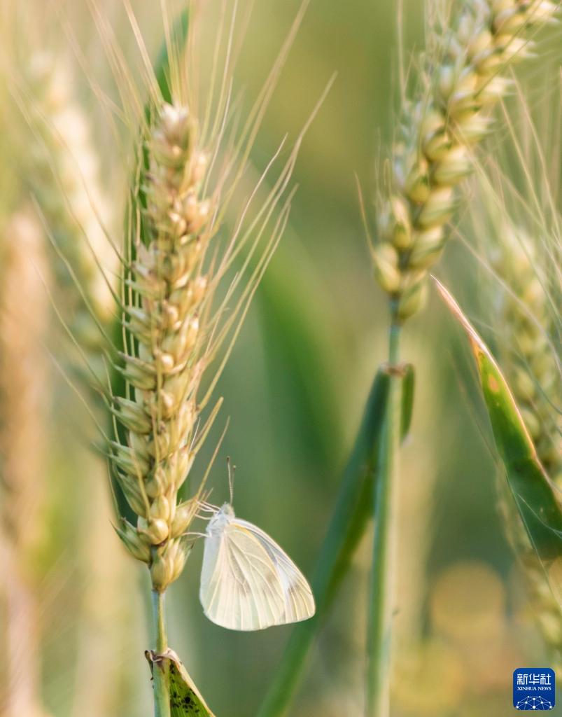 4月24日,在四川省成都市金堂縣,蝴蝶在吐芒的麥子上駐足。