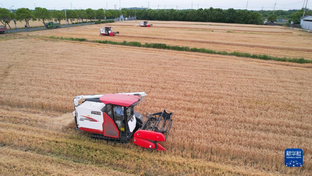 5月23日,在江蘇省太倉(cāng)市璜涇鎮(zhèn)雅鹿村,農(nóng)民駕駛收割機(jī)搶收小麥(無(wú)人機(jī)照片)。