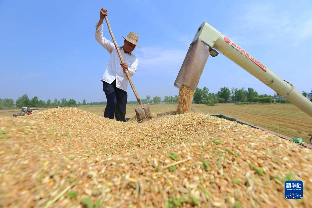 5月24日,在湖北襄陽(yáng)棗陽(yáng)市吳店鎮(zhèn)肖灣村,村民在田間收獲小麥。