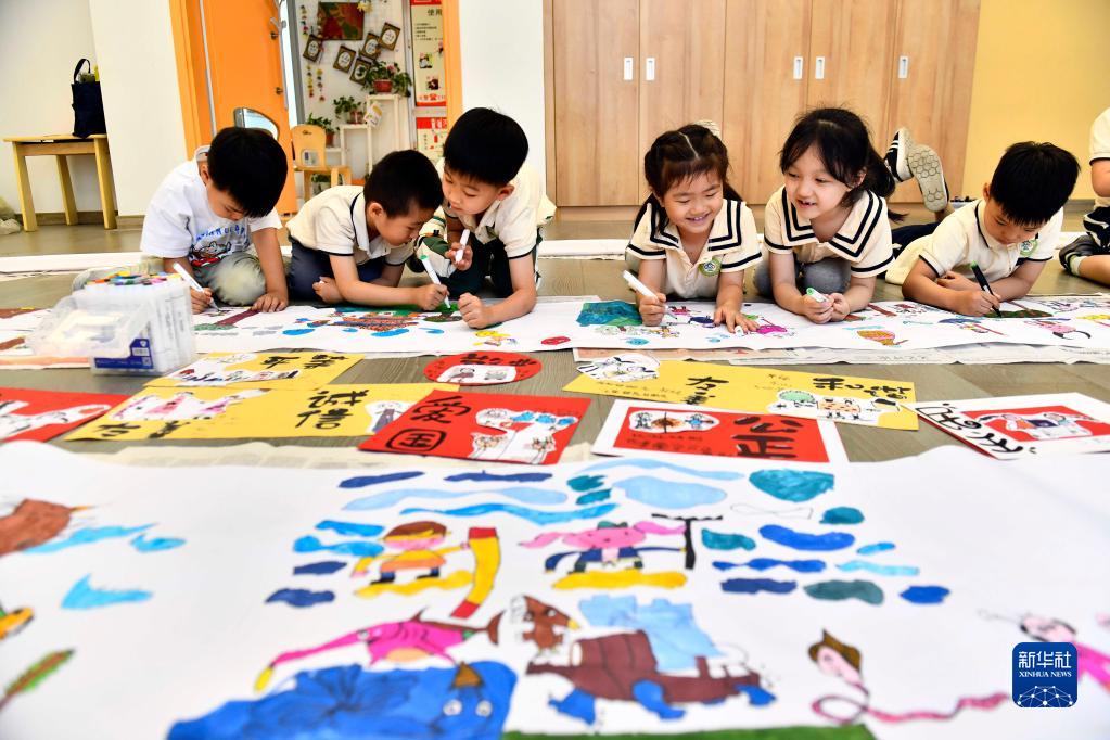 5月30日,在山東省實驗幼兒園,孩子們在手繪《西游記》圖畫。