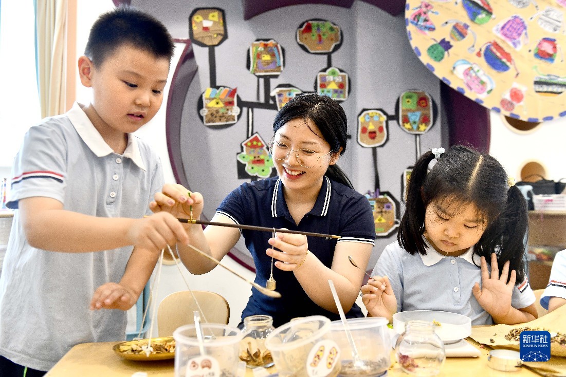 5月30日,在山東省實驗幼兒園,老師帶著孩子們體驗花草紙制作。新華社記者 郭緒雷 攝