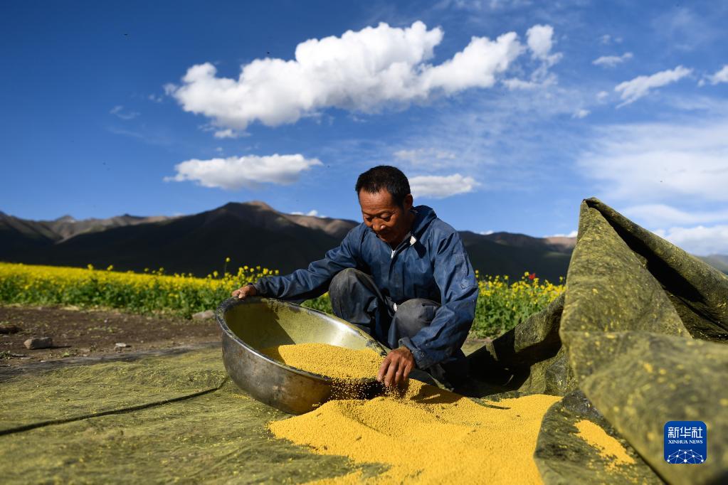 7月2日,在青海省海北藏族自治州門源回族自治縣,馮躍宣將晾曬好的花粉裝入盆中。