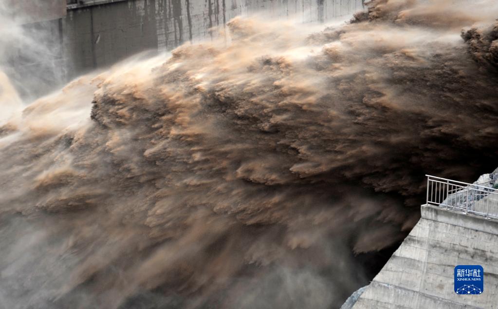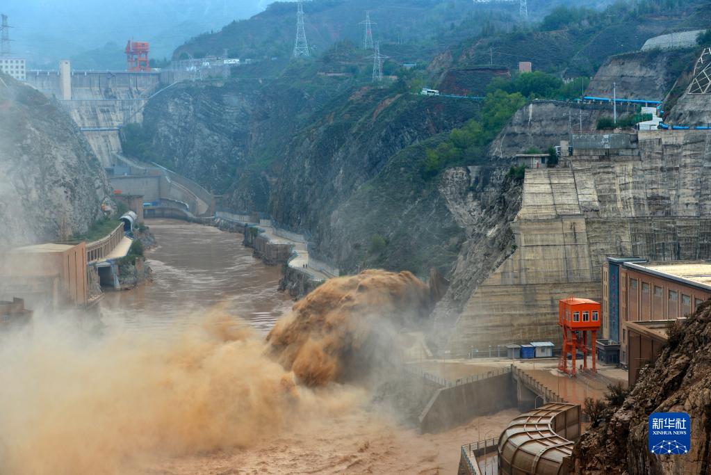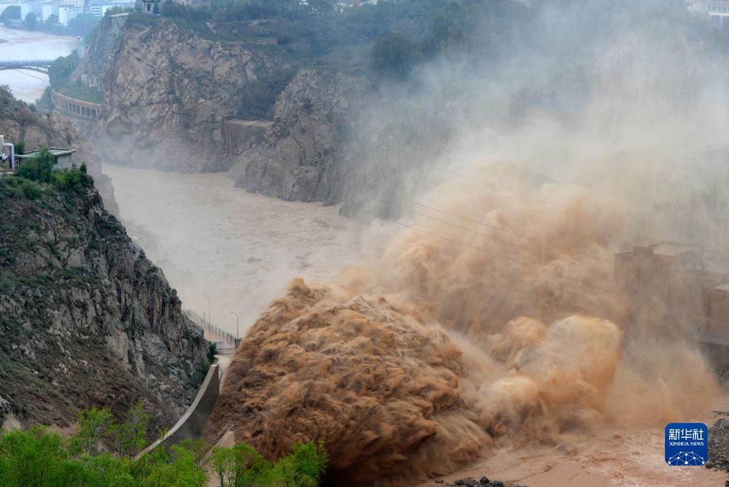 當(dāng)日,受強(qiáng)降水天氣影響,黃河劉家峽水庫來沙量急劇增加,劉家峽水庫按照調(diào)度要求進(jìn)行調(diào)水排沙。夾裹著大量泥沙的水流從排沙洞出口噴涌而出,場(chǎng)面壯觀。