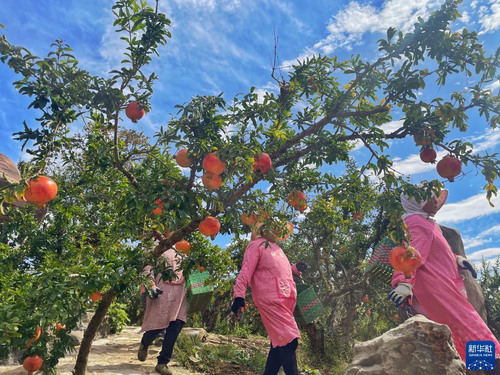 10月9日,在嶧城區(qū)榴園鎮(zhèn)萬畝石榴園,工人上山采摘石榴。