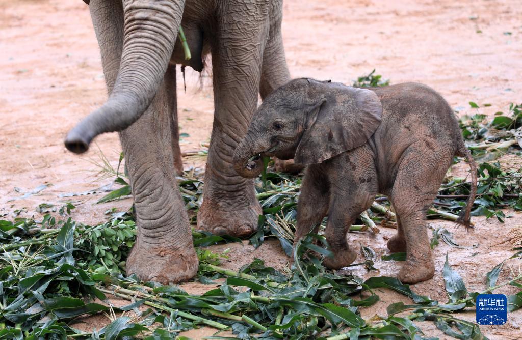 11月3日,兩頭新生非洲象寶寶在媽媽陪伴下玩紅泥。