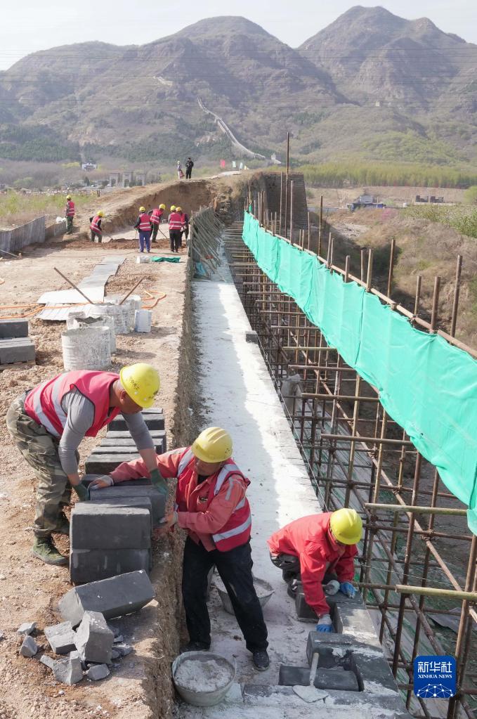 4月19日,工人在山海關(guān)長(zhǎng)城北翼城修繕工程工地施工。