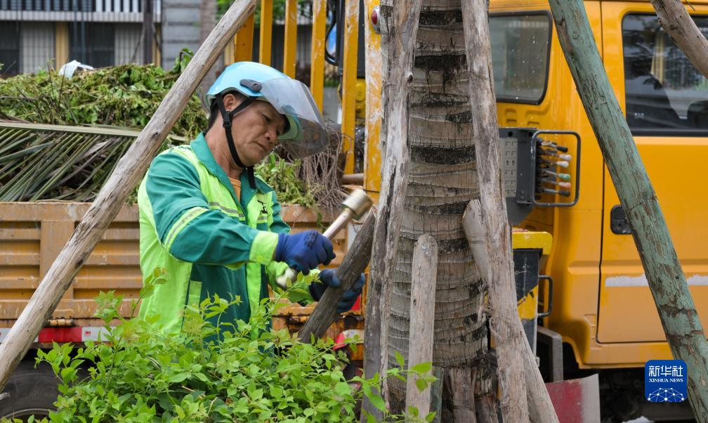 7月17日,在??谑行潞4蟮?,工作人員對(duì)樹(shù)木進(jìn)行加固。