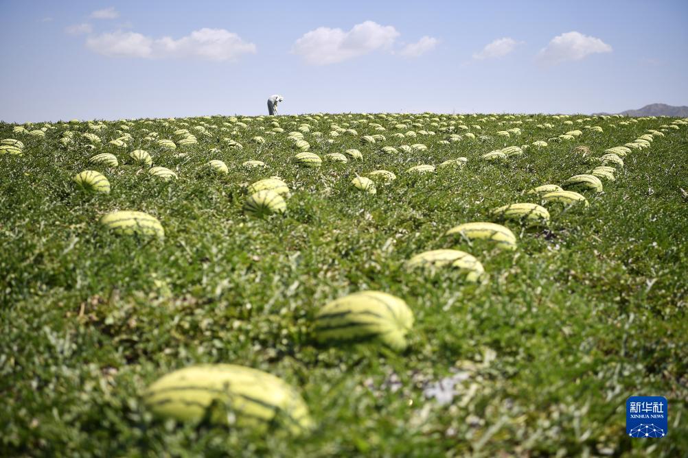 農(nóng)戶在中衛(wèi)市沙坡頭區(qū)香山鄉(xiāng)收獲硒砂瓜(7月21日攝)。