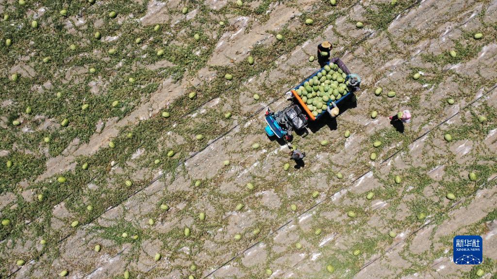 農(nóng)戶在中衛(wèi)市沙坡頭區(qū)香山鄉(xiāng)收獲硒砂瓜(無人機(jī)照片,7月21日攝)。