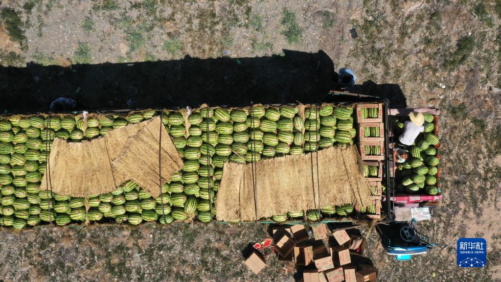 農(nóng)戶在中衛(wèi)市沙坡頭區(qū)香山鄉(xiāng)將硒砂瓜裝車運(yùn)往湖北(無人機(jī)照片,7月21日攝)。