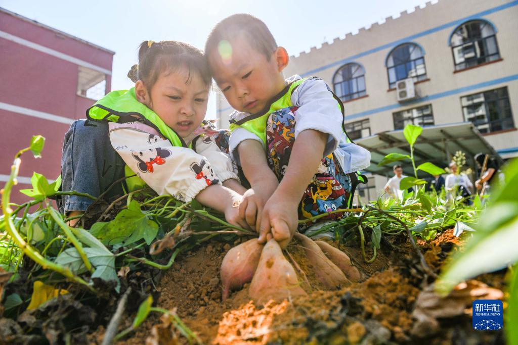 10月16日,湖南省永州市道縣城東幼兒園的小朋友在體驗(yàn)采收紅薯。