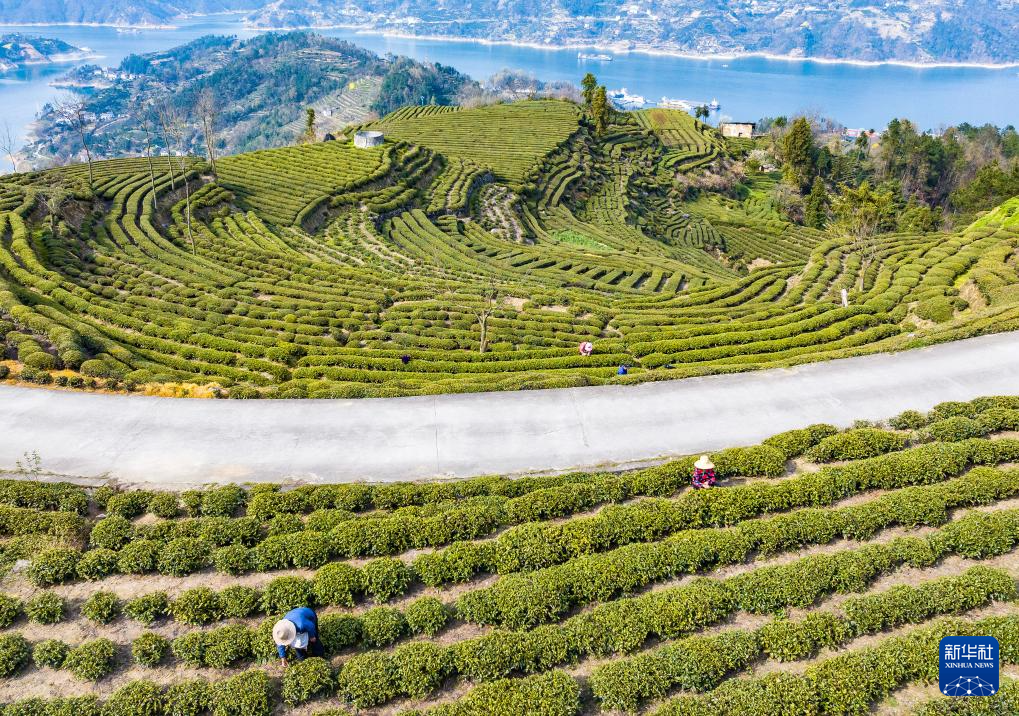 3月18日,湖北省宜昌市秭歸縣茅坪鎮(zhèn)陳家壩村村民在茶園采摘新茶(無(wú)人機(jī)照片)。