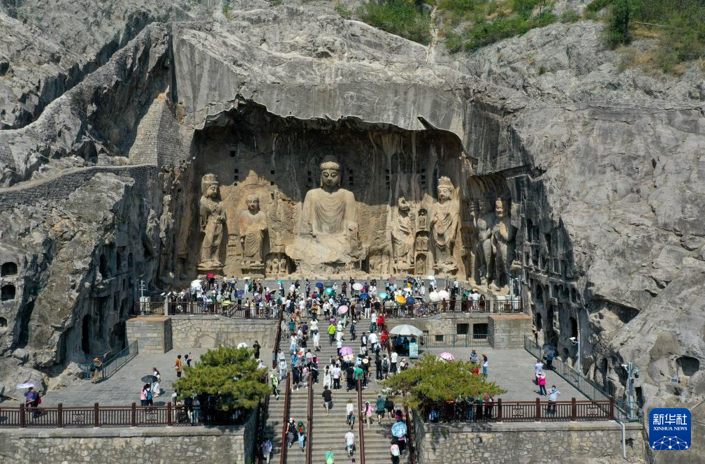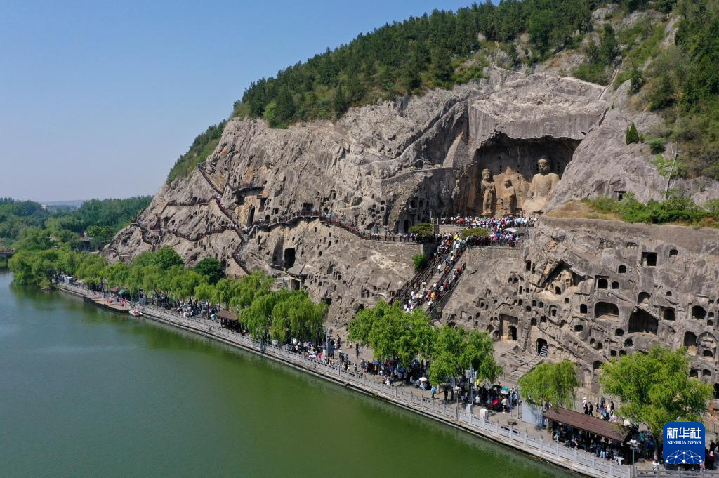 5月20日,游客在龍門石窟游玩(無人機照片)。