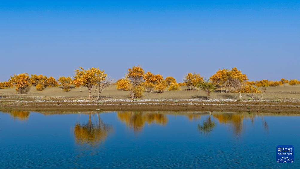 時(shí)下,新疆和田地區(qū)的胡楊迎來最佳觀賞期,成片換妝的胡楊林與水天相映,共繪金秋美景。