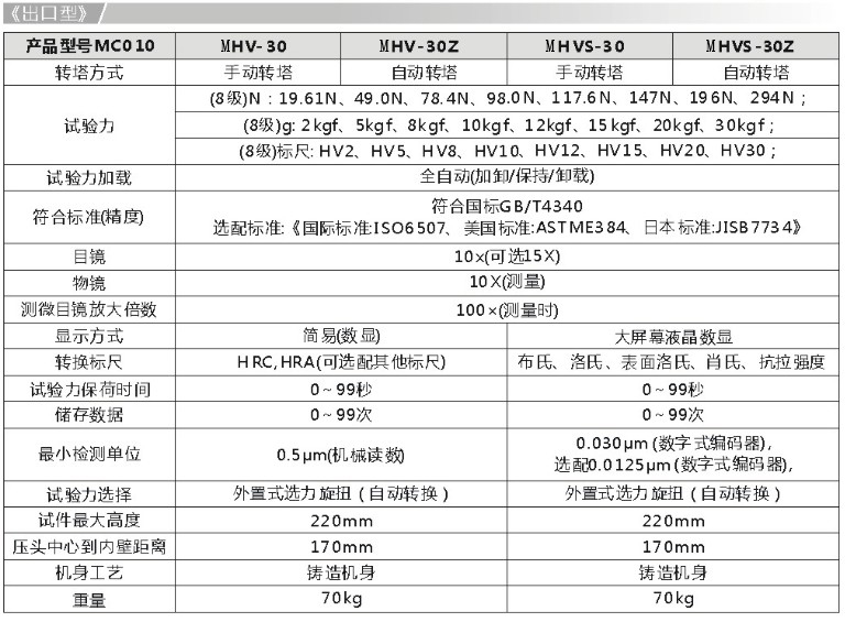 (8級)標(biāo)尺: HV1、HV3、HV5、HV10、HV20、HV30; |